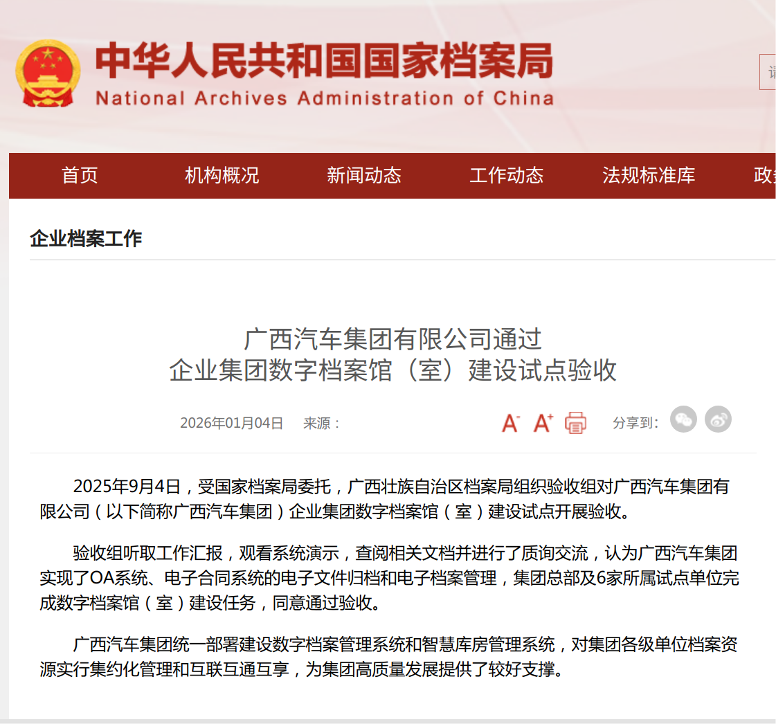 開年好消息!國家檔案局:廣西汽車集團通過此項驗收